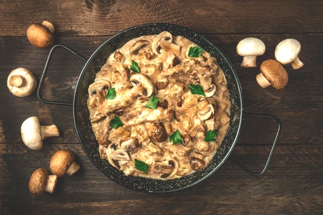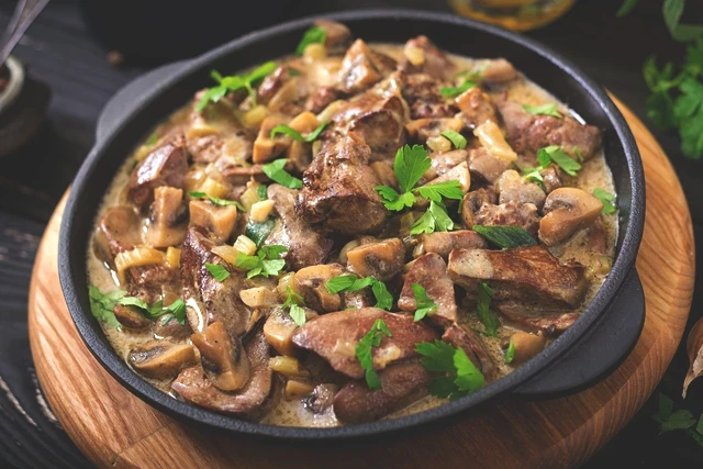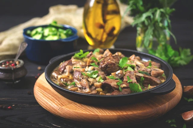 Mantarlar küçülmeye başladığında salçayı ve küp doğranmış kabuksuz domatesleri ekleyin. Sıcak suyu, tuzu ve baharatları katıp tavanın kapağını kapatın. Etler yumuşak olana dek kısık ateşte pişirin.