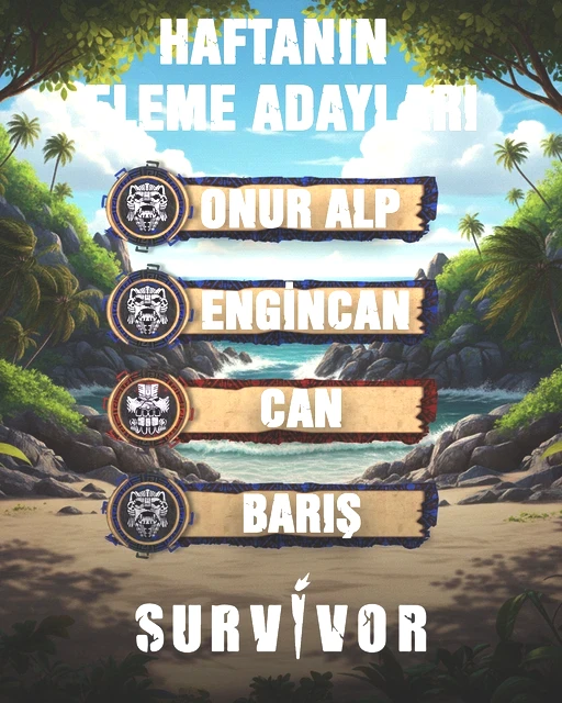 Survivor'da bu hafta elenme potasına giren isimler sırasıyla; Onur Alp, Engincan, Can ve Barış oldu.